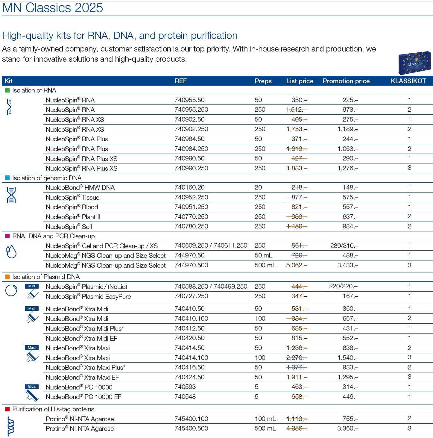Suosituimmille kiteille on nyt kaikille voimassa olevat erikoishinnat: säästä peruseristyksissä, nauti Macherey-Nagel-laadusta!