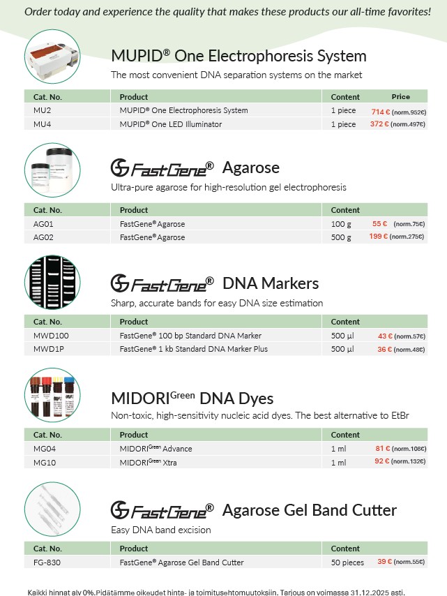Alennuksia agaroosista, DNA-väreistä ja -markkereista, band-leikkureista ja jopa itse elektroforeesilaitteistosta!